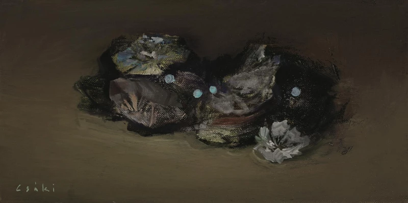 In this complex, multilayered world there are no fixed boundaries, everything is fantastical. Real faces disappear, things lose their original properties, beauty becomes ugly, while ugliness is disguised and appears as beauty. Csáki's vulnerable protagonist becomes a lonely outcast living in their own shell, surrounded by an unfriendly world. They retreat into their inner world as a way of self defense. Csáki's protagonists challange the viewer's preconcieved prejudices and views connected to specific concepts - such as beauty and uglyness - with surprising grotesqueness.